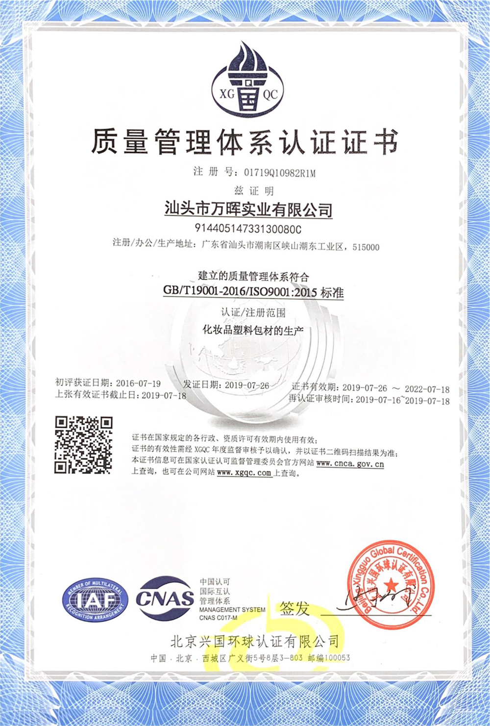 質(zhì)量管理體系認(rèn)證證書(shū)